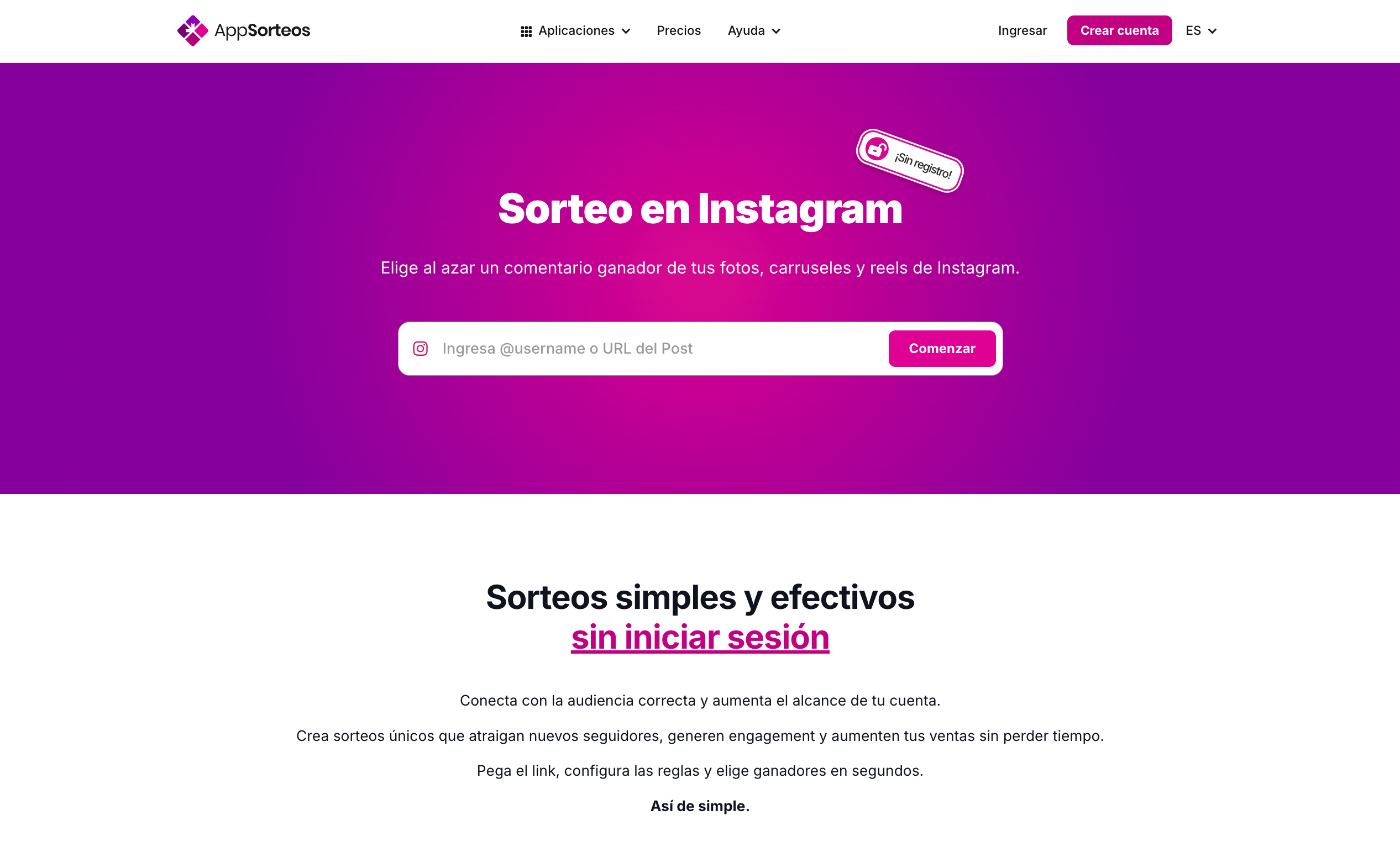 Sortealo es una herramienta para sorteos en Instagram enfocada en Instagram que opera con un enfoque de simplicidad primero y no requiere registro de usuario.